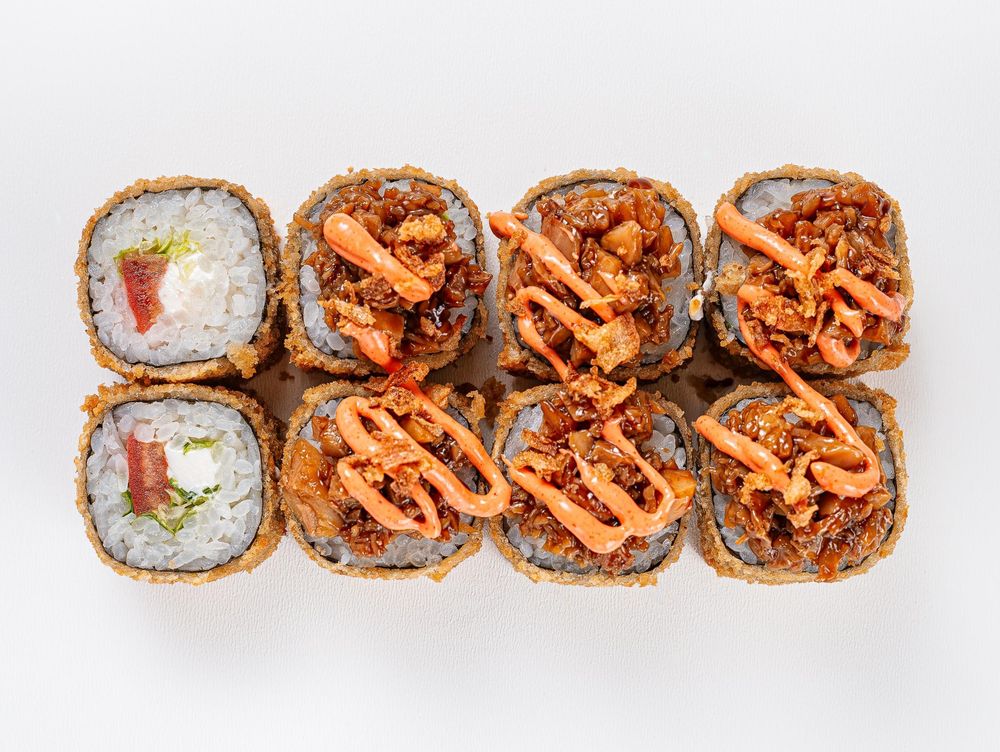 Курица терияки, томат, айсберг, твороженный сыр, под соусами унаги ирозовая корея, украшен карамельным луком