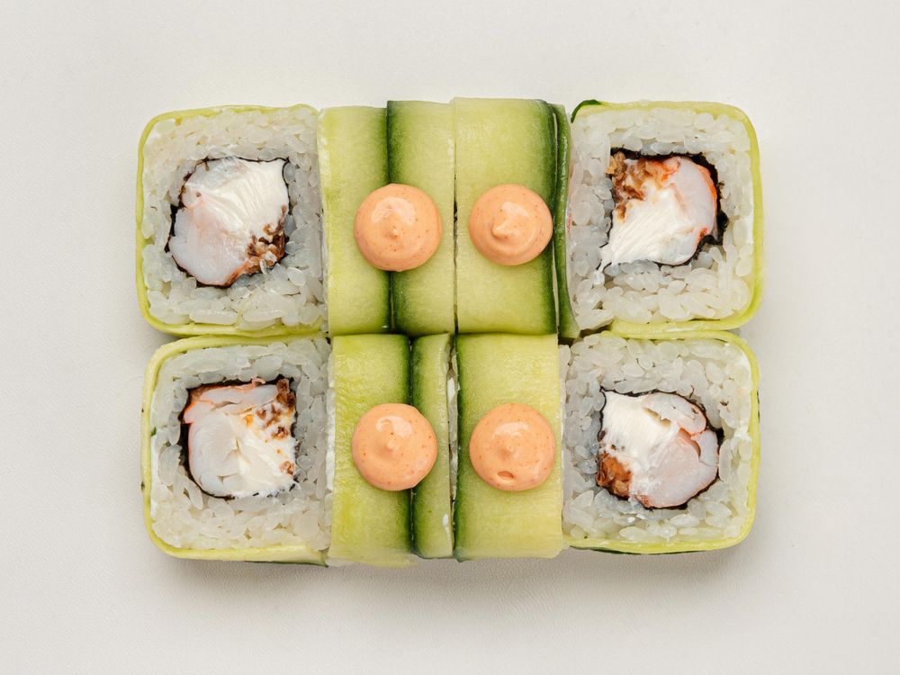креветка в сочетании творожным сыром и карамельным луком в огурце с добавлением спайси соуса