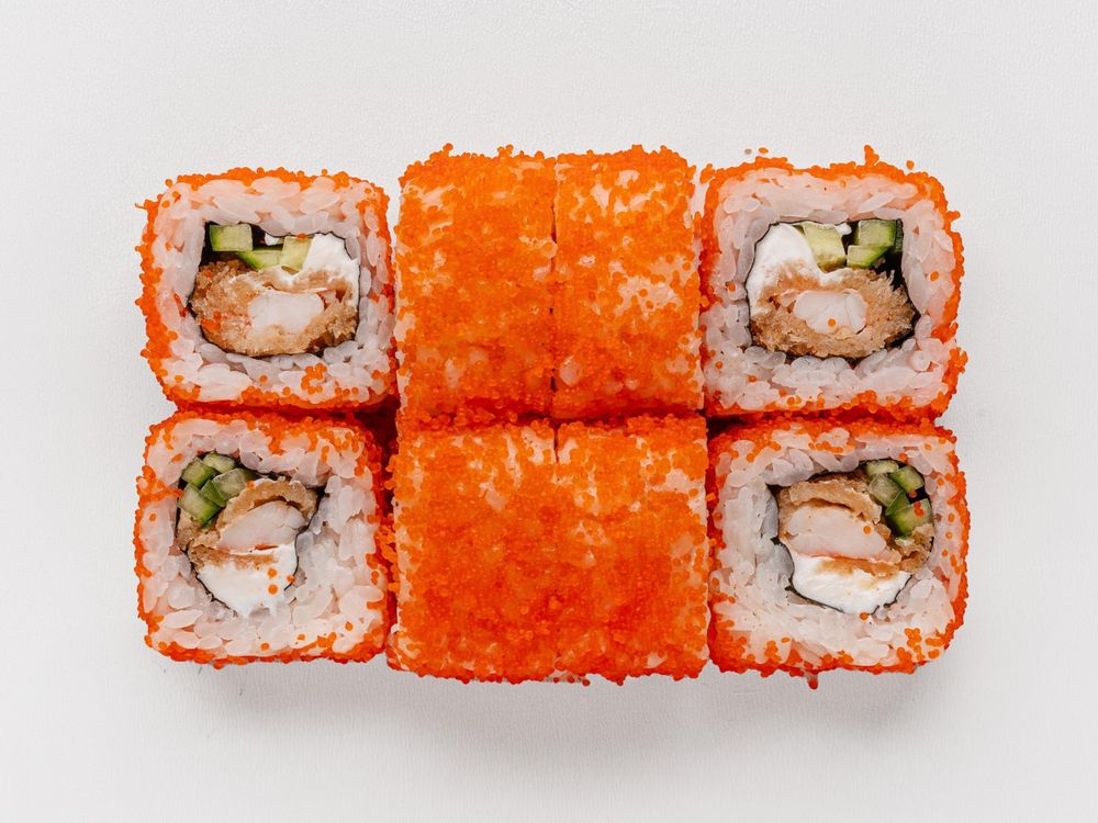 Креветка, майонез, рис, икра масаго оранжевая, огурец