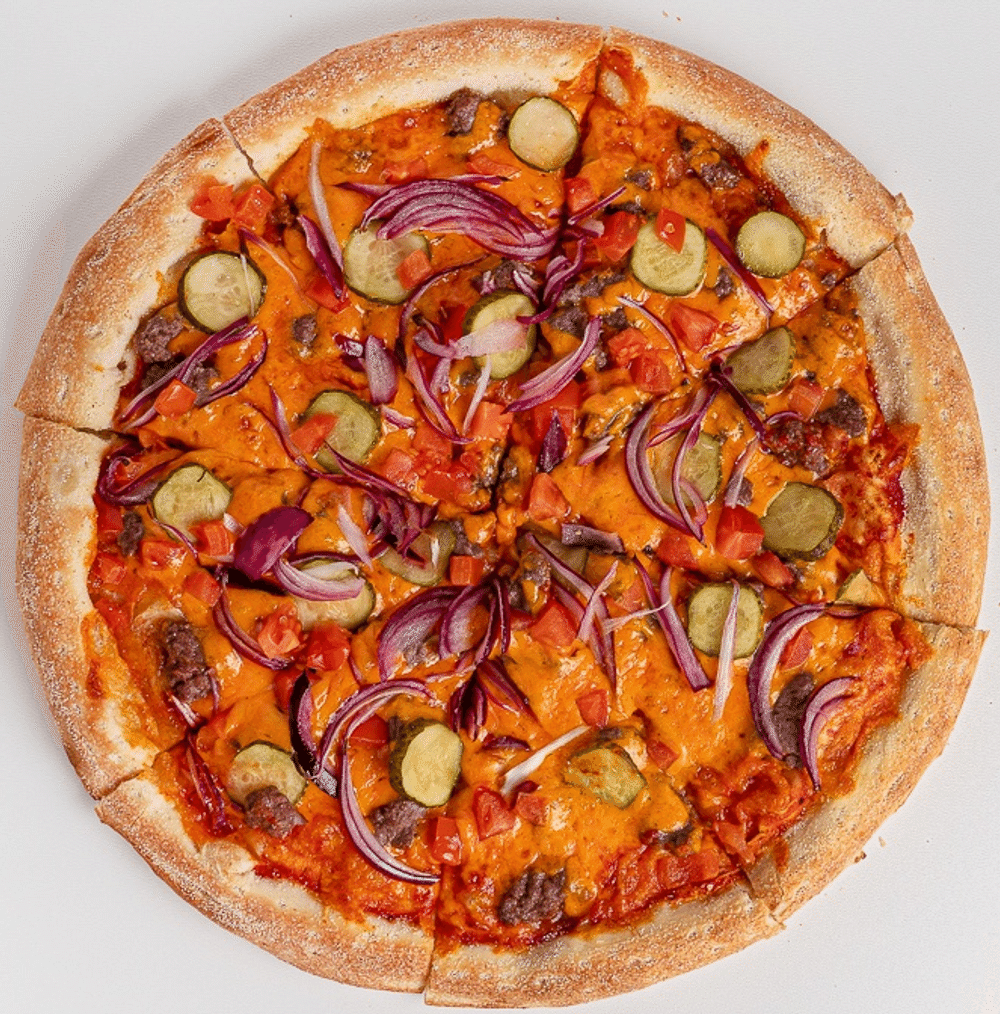 Оригинальная пицца на фирменном тесте с двумя сырами чеддер и моцарелла, говяжьим фаршем, маринованным огурцом и красным луком