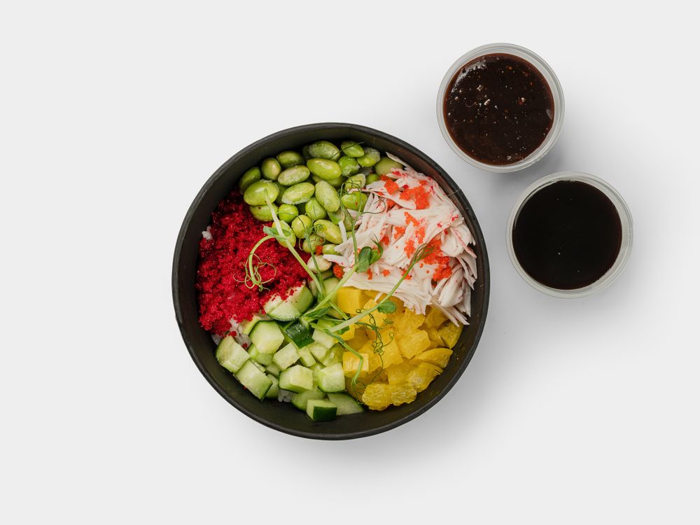 Снежный краб, бобы эдамаме, такуан, огурец, масаго, рис фирменный подается с соусами Поке и Блек Пеппер