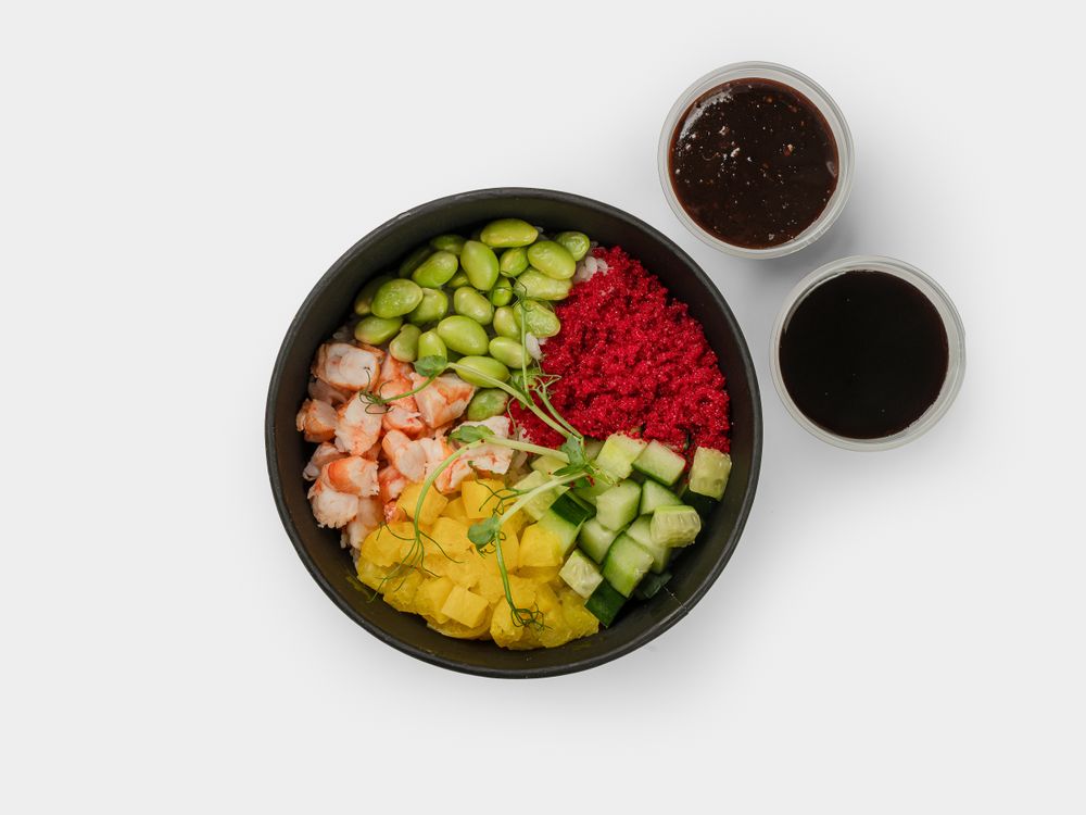 Креветка ваннамэй, бобы эдамаме, такуан, огурец, масаго, рис фирменный подается с соусами Поке и Блек Пеппер