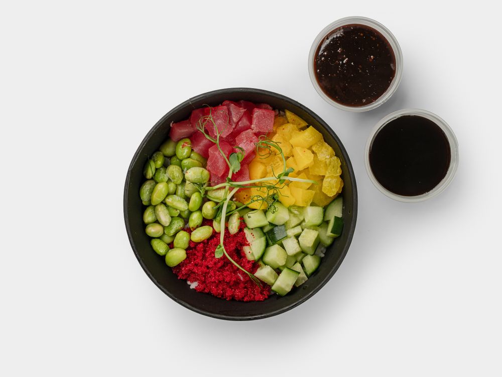 Тунец, бобы эдамаме, такуан, огурец, масаго, рис фирменный подается с соусами Поке и Блек Пеппер