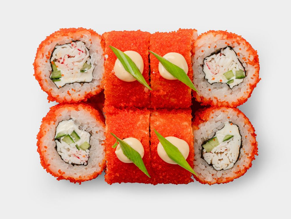 Снежный краб, сливочный сыр, огурец в оранжево масаго, украшен белым соусом и свежим луком.