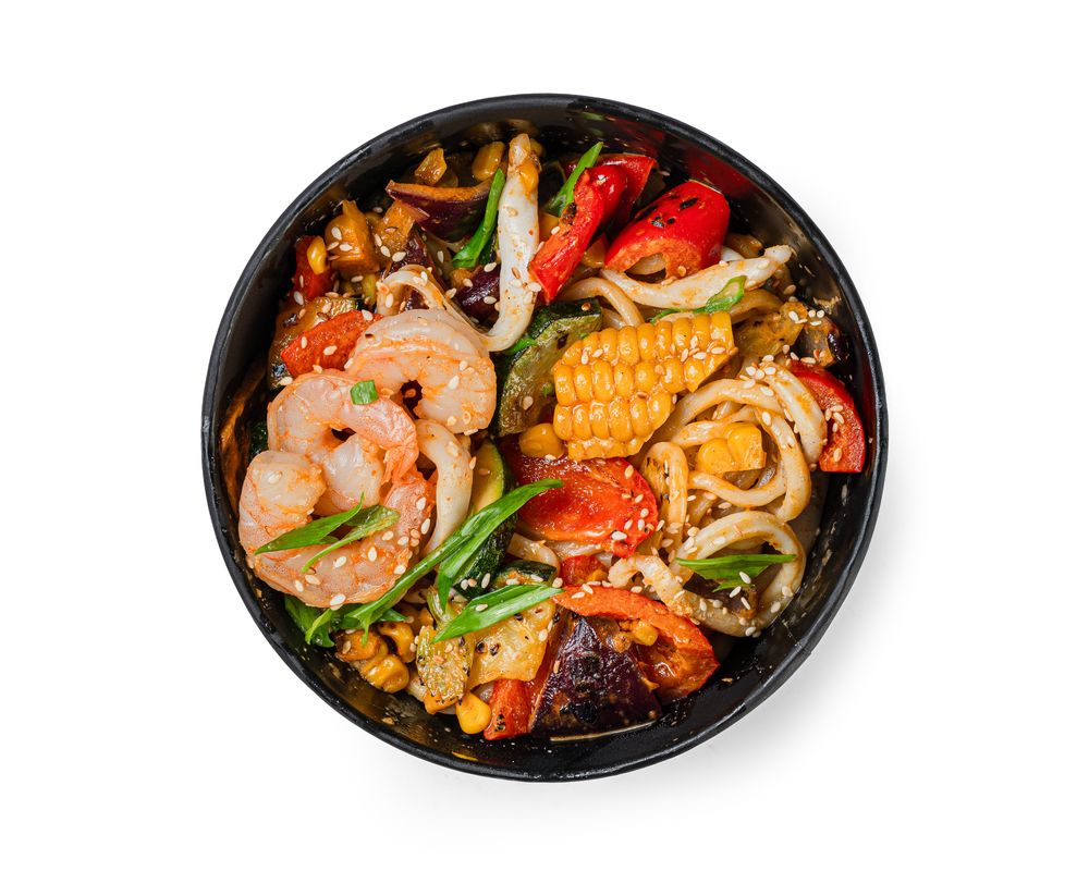 Королевкие креветки и кальмар обжаренные с овощами(кукуруза, цукини, перец болгарский, сельдерей, лук красный в соусе том ям с крафтовой лапшой удон.
