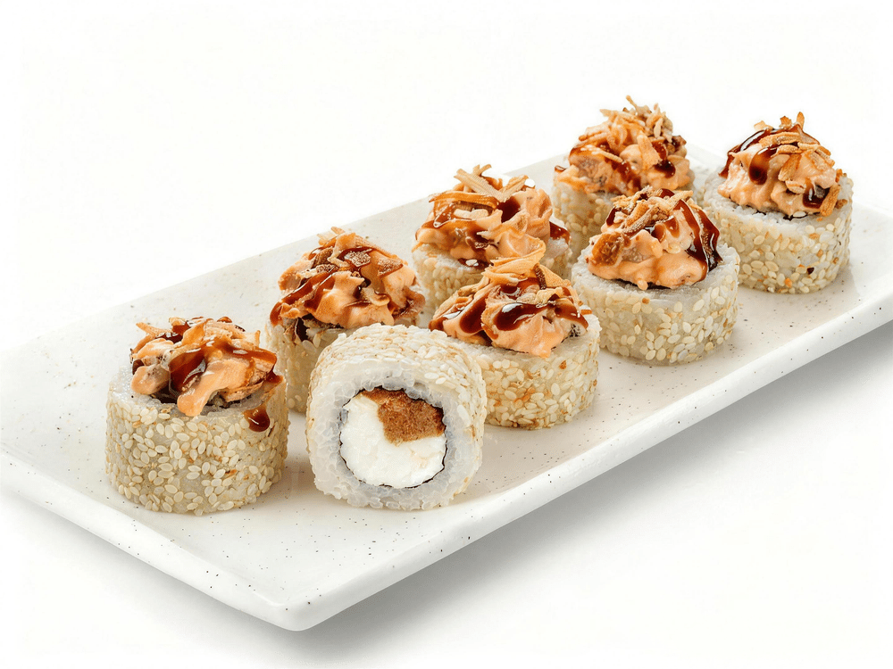 Угорь, омлет тамаго, творожный сыр, карамельный лук, спайси соус, унаги соус, кунжут, рис, нори