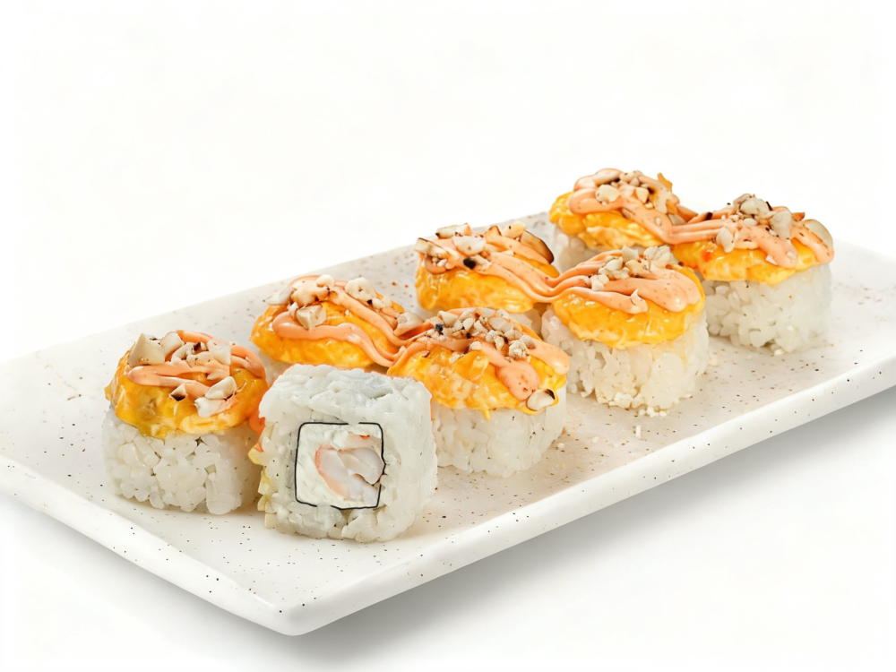 Креветка, творожный сыр, смесь из сыра чеддер, рис, нори. Украшен спайси соусом и арахисом