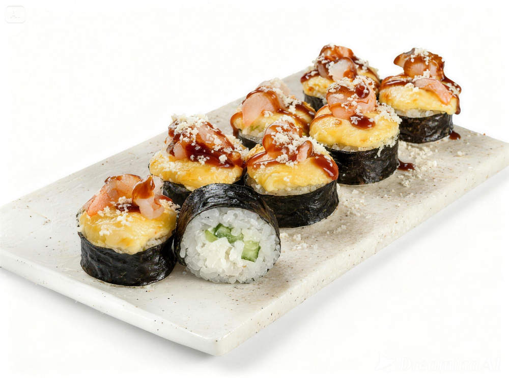 Осторожно!!! Это слишком вкусно!!! Королевская креветка, соус гауда с пармезаном, творожный сыр, пармезан тёртый, огурец, рис, нори, соус унаги