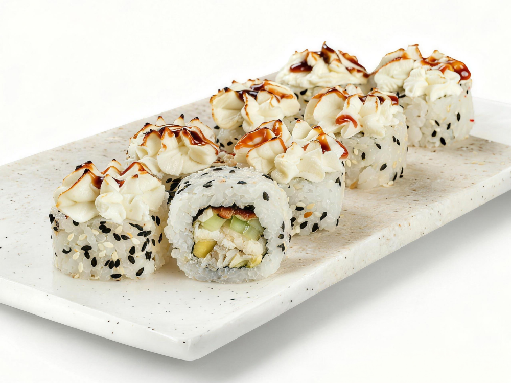 Угорь, подпеченный творожный сыр, авокадо,. огурец, унаги соус, микс кунжут, рис, нори