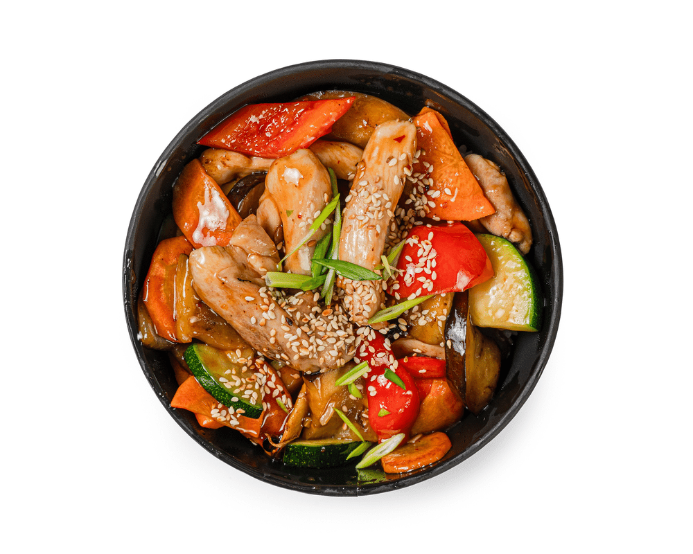 Фирменный рис с нежным куринным филе с добавлением устричного соуса и сока имбиря, цукини, баклажан, перец болгарский, морковь, айсбер, чеснок обжаренные на вок сковороде, украшены поджеренным кунжутом и зелёным луком