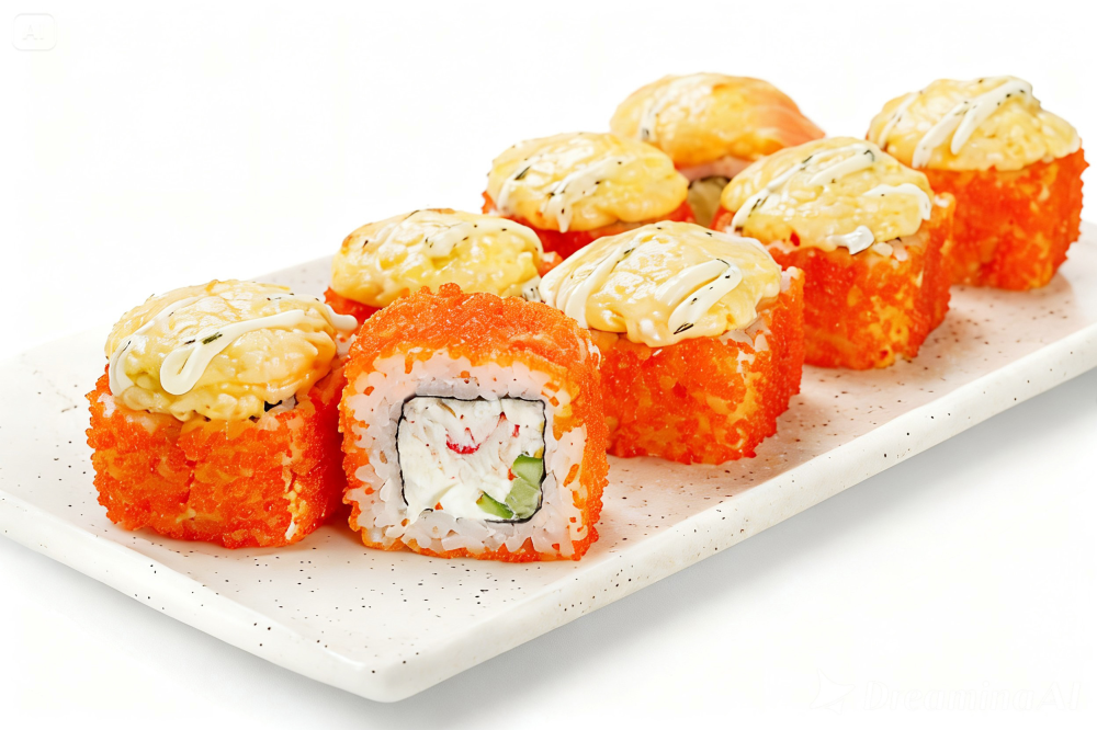 Краб микс, огурец, творожный сыр, икра масаго, белый сырный соус, рис, нори