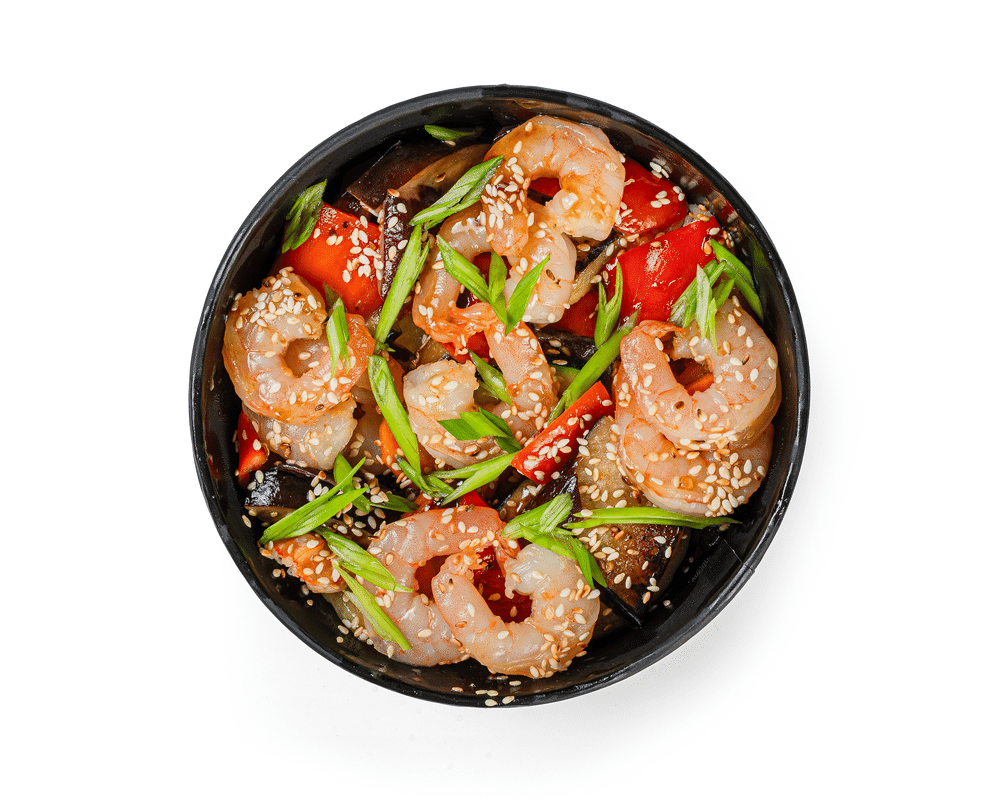 Фирменный рис с креветками обжаренными в нежном соусе на кокосовом молоке, цукини, баклажан, перец болгарский, морковь, айсберг обжаренные на вок сковороде , украшены поджеренным кунжутом и зелёным луком
