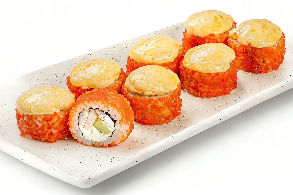 Меняем стереотипы!!! Начинки в 2 раза больше чем риса!!! Королевская креветка, творожный сыр, микс из сыров пармезан и гауда, авокадо, икра масаго, рис, нори