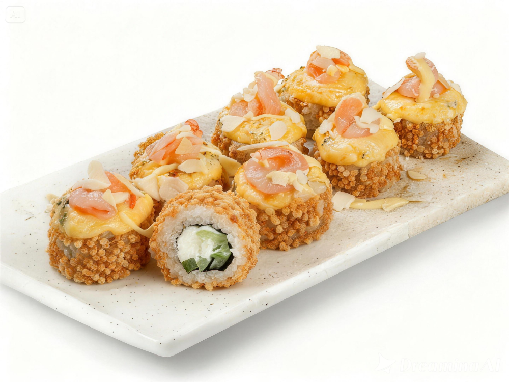 Осторожно!!! Это слишком вкусно!!! Королевские креветки, творожный сыр, огурец, микс сыров пармезан и гауда, крошка сыра дор блю, соус манго майо, миндаль лепестки, воздушный рис, рис, нори