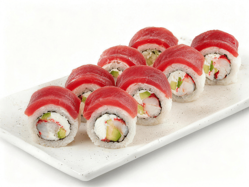 Меняем стереотипы!!! Начинки в 2 раза больше чем риса!!! Тунец, королевская креветка, творожный сыр, икра масаго, авокадо, крабовое мясо, рис, нори