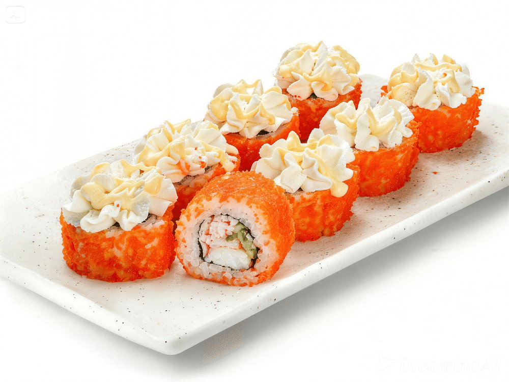 Креветка, краб микс, огурец,творожный сыр, икра масаго, соус манго-чили, рис, нори