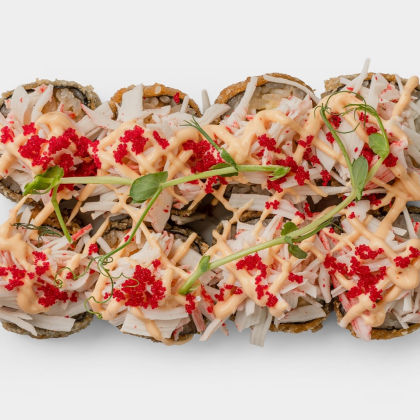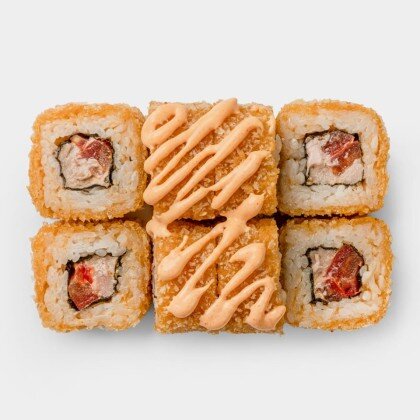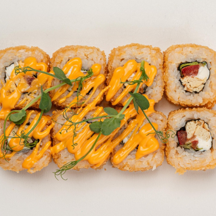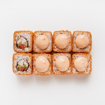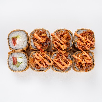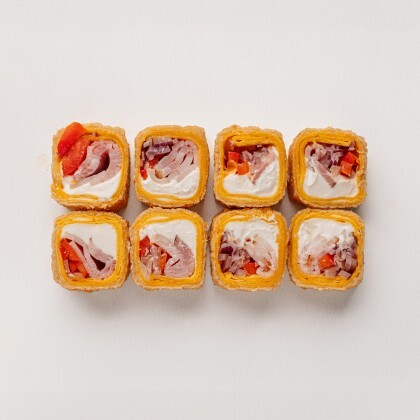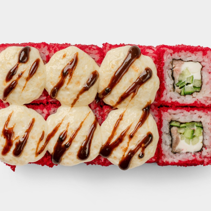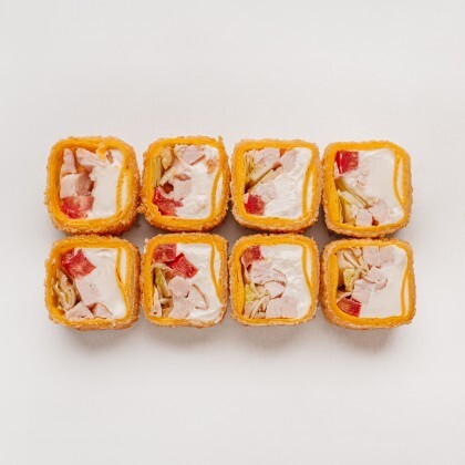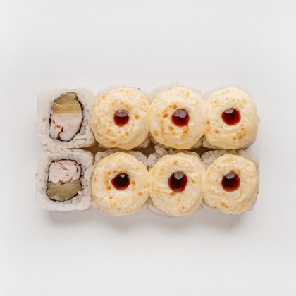 Курица терияке, сливочный сыр, салат листовой под нежной шапочкой из сыра гауда и соуса терияке