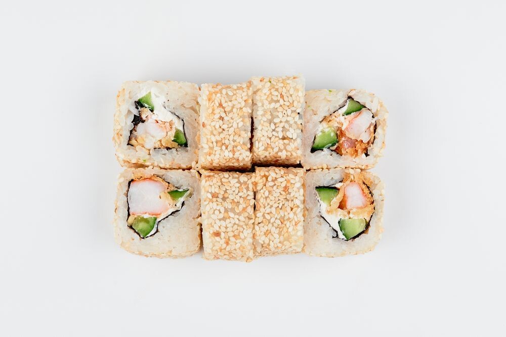 Креветка обжаренная в кляре, огурец, сливочный сыр, тобико оранжевая, кунжут