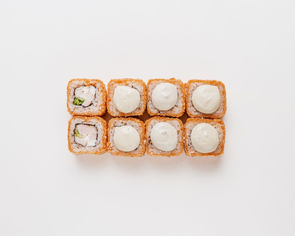 Курица, рис, пекинская капуста, сливочный сыр, соус Тар-тар, кляр, сухари